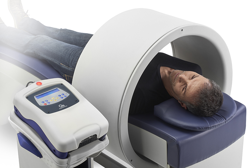 Thiết bị PMT Qs ứng dụng từ trường ELF (Tần số cực thấp) song song với trục tung (trục thẳng đứng) của cơ thể bằng ống dây từ tính, hoặc vuông góc với vùng cần điều trị bằng bản cực Flexa.