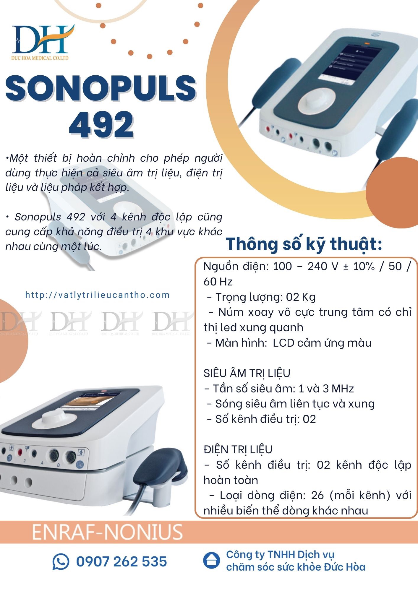 Sonopuls 492 là thiết bị đứng đầu trong dòng sản phẩm 4-series. Một thiết bị hoàn chỉnh cho phép người dùng thực hiện cả siêu âm trị liệu, điện trị liệu và liệu pháp kết hợp.