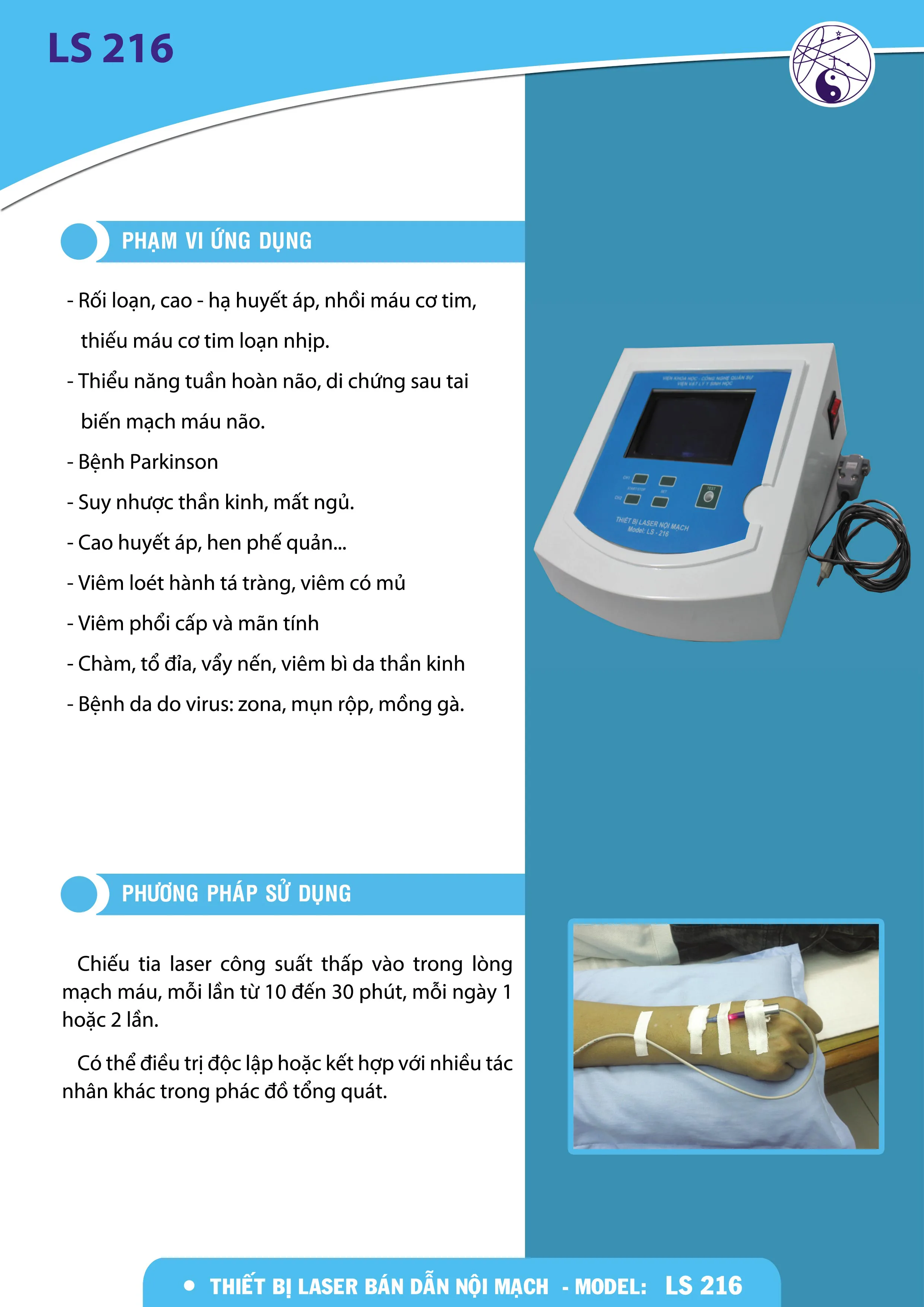 Thiết bị được sử dụng trong các khoa, phòng vật lý trị liệu để điều trị bệnh bằng cách chiếu chùm tia laser công suất thấp với bước sóng 650 nm vào bên trong lòng tĩnh mạch thông qua bộ kim luồn nội mạch, để chiếu laser trực tiếp vào dòng máu đang lưu chuyển trong cơ thể, làm cho máu sản sinh ra các phản ứng quang hóa và hiệu ứng kích thích sinh học, đưa đến các hiệu quả điều trị như: Tăng sức đề kháng cho tế bào, tăng tái sinh tổ chức, tăng vi tuần hoàn máu, giảm kết dính hồng cầu, chống viêm...Thiết bị có thể kết hợp cùng lúc với các thiết bị từ trị liệu hoặc các thiết bị vật lý trị liệu khác để nâng cao hiệu quả điều trị.