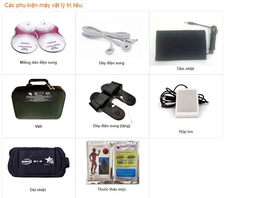 Khi mua 1 máy bao gồm: 1 Máy chính, 1 dây xung, 1 đôi miếng dán điện xung, 1 tấm dải nhiệt, 1 valy sang trọng, 1 gói thuốc, và hộp ion.